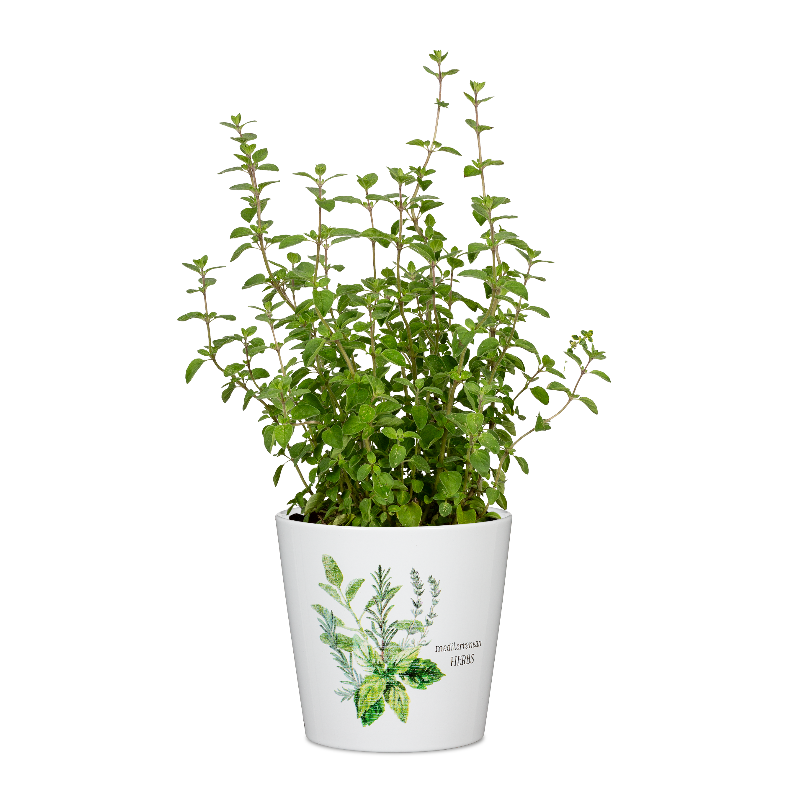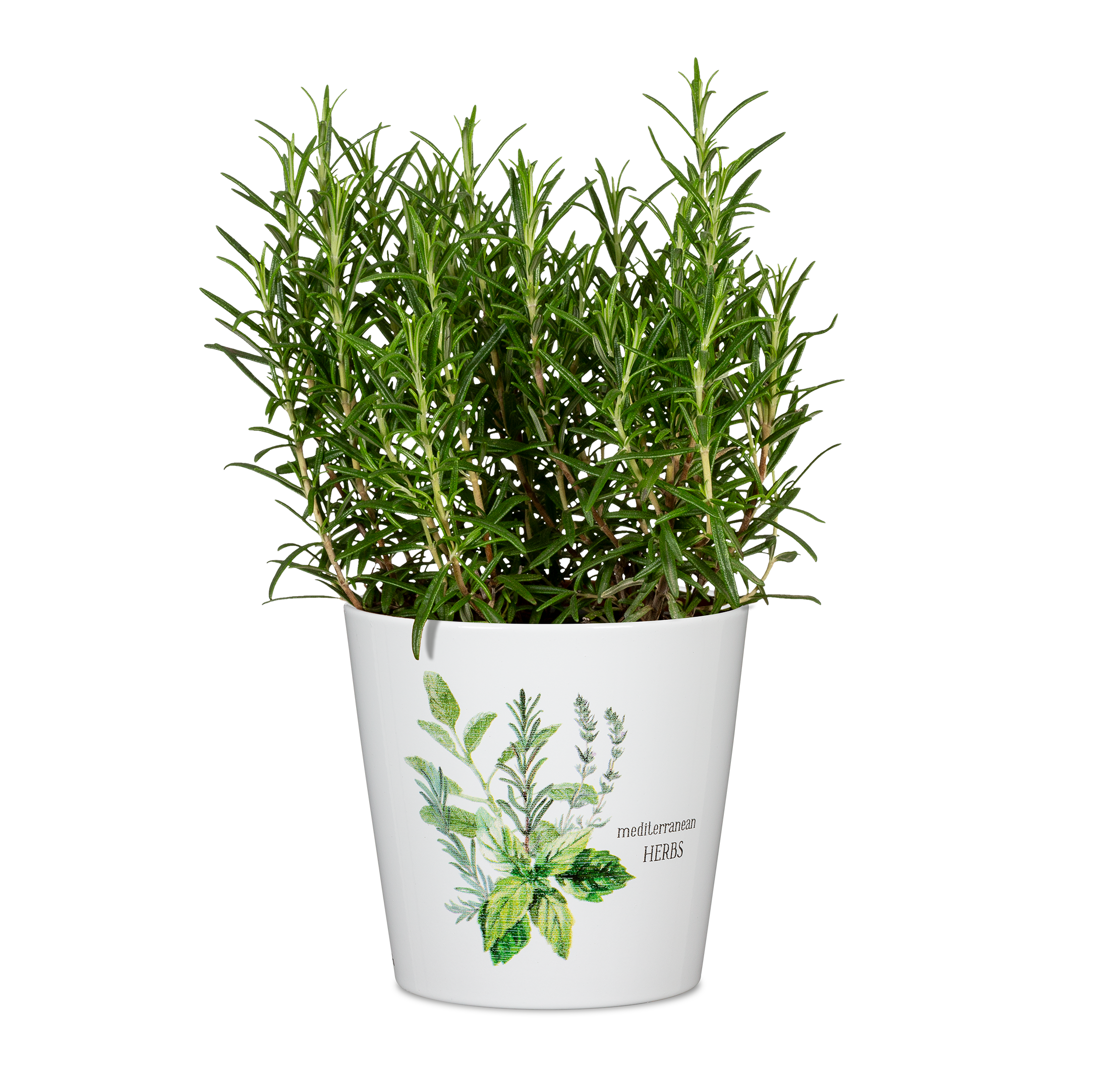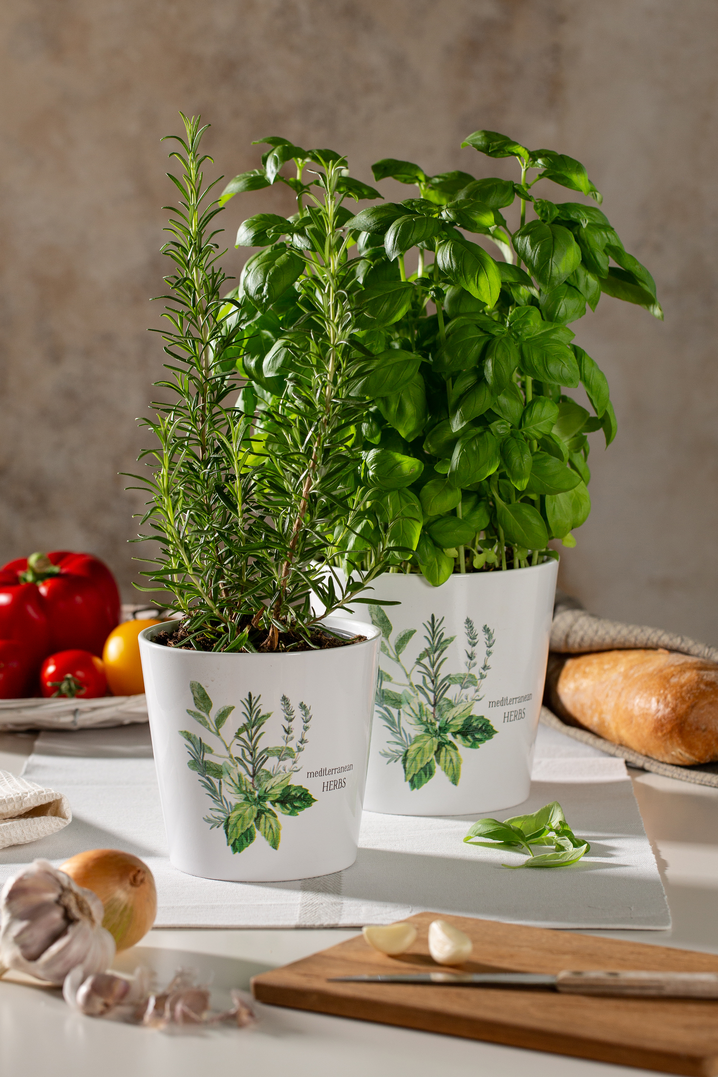 Mit dem realistischen Motiv und dem Schriftzug „Mediterranean Herbs“ auf weißer Oberfläche spiegelt das Dekor das südliche Lebensgefühl wider. Die Zweige und Blätter von Salbei, Minze, Rosmarin und Thymian treten durch das innovative Polyprint-Verfahren besonders detailliert hervor. Damit auch in der Realität alles passt, ist Mediterranean in zwei Größen und damit für alle gängigen Kräutertöpfchen erhältlich.