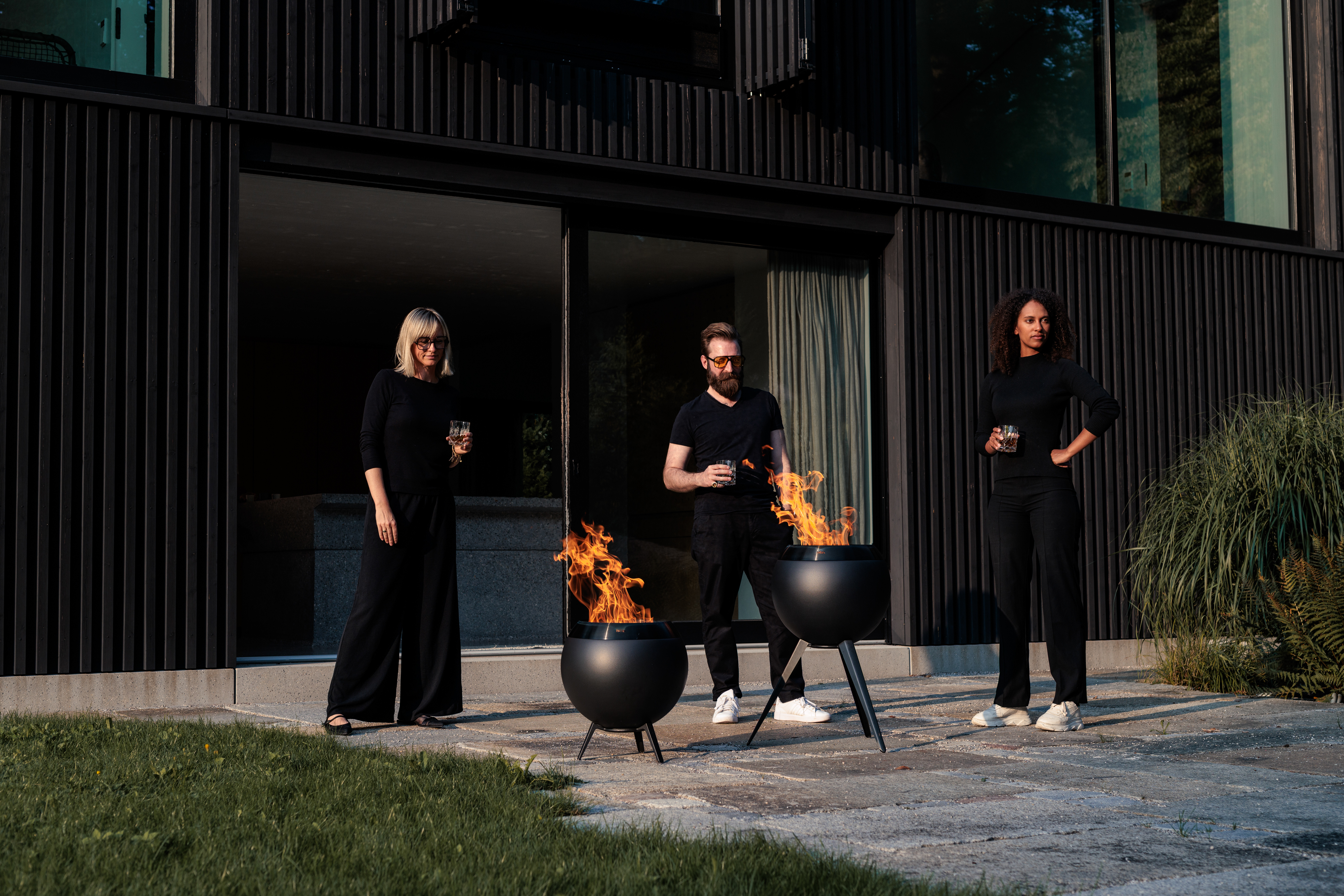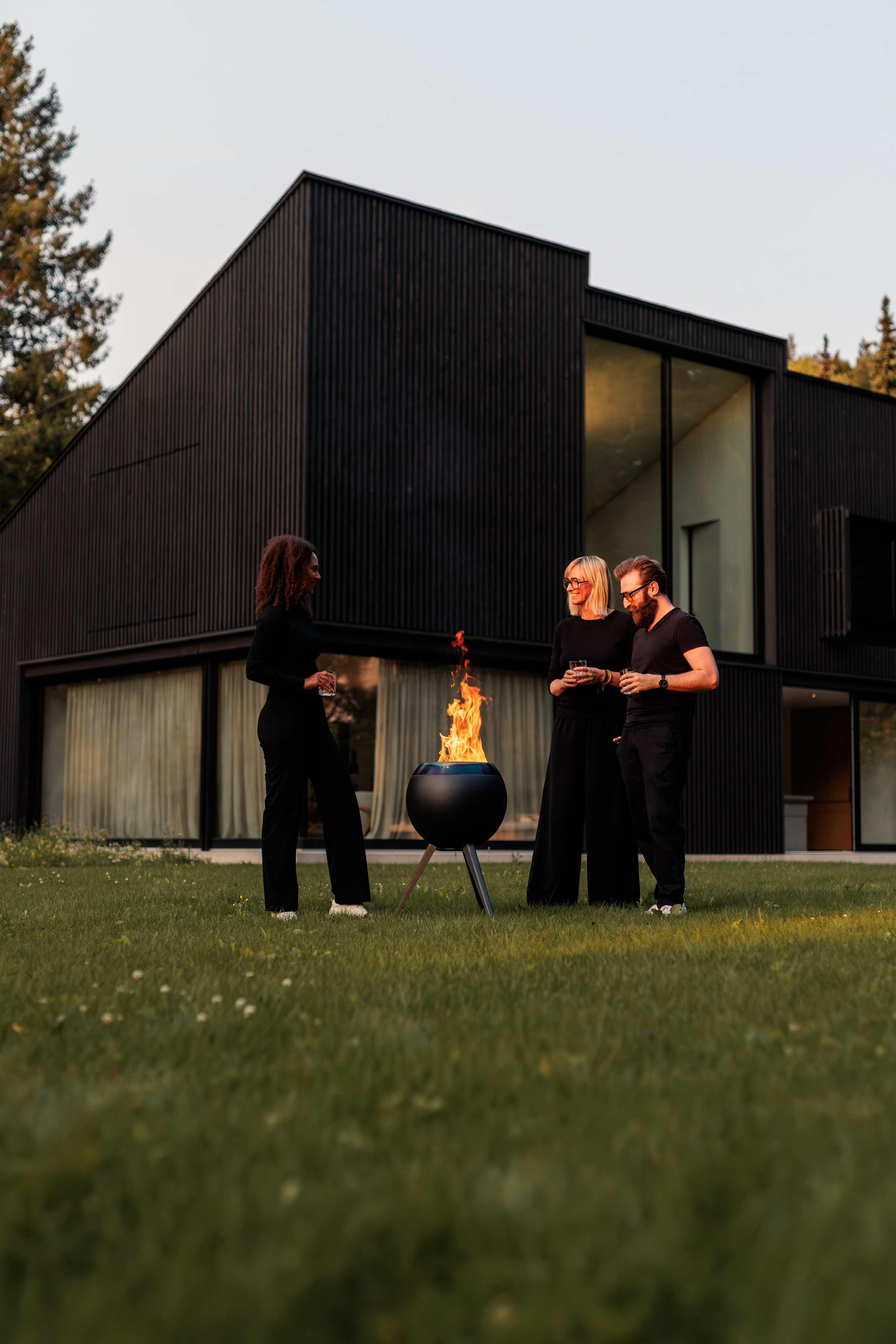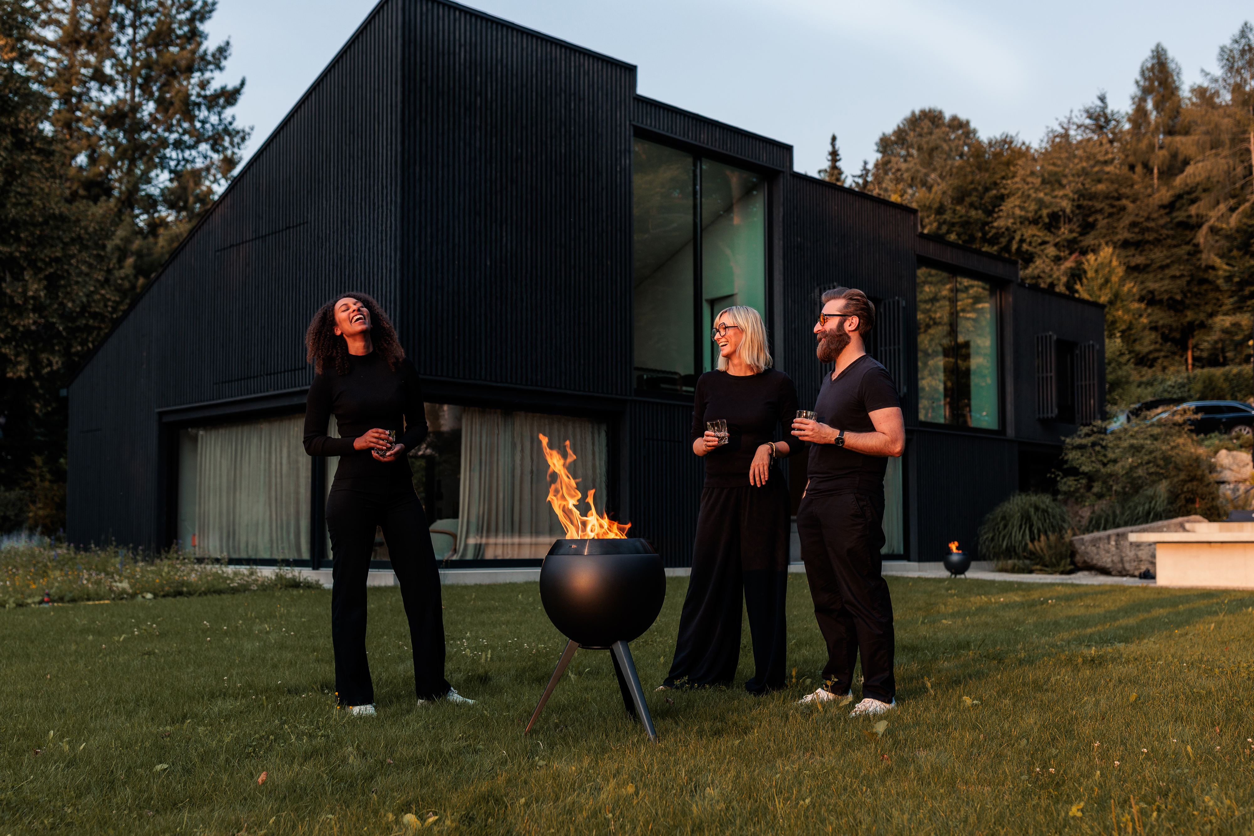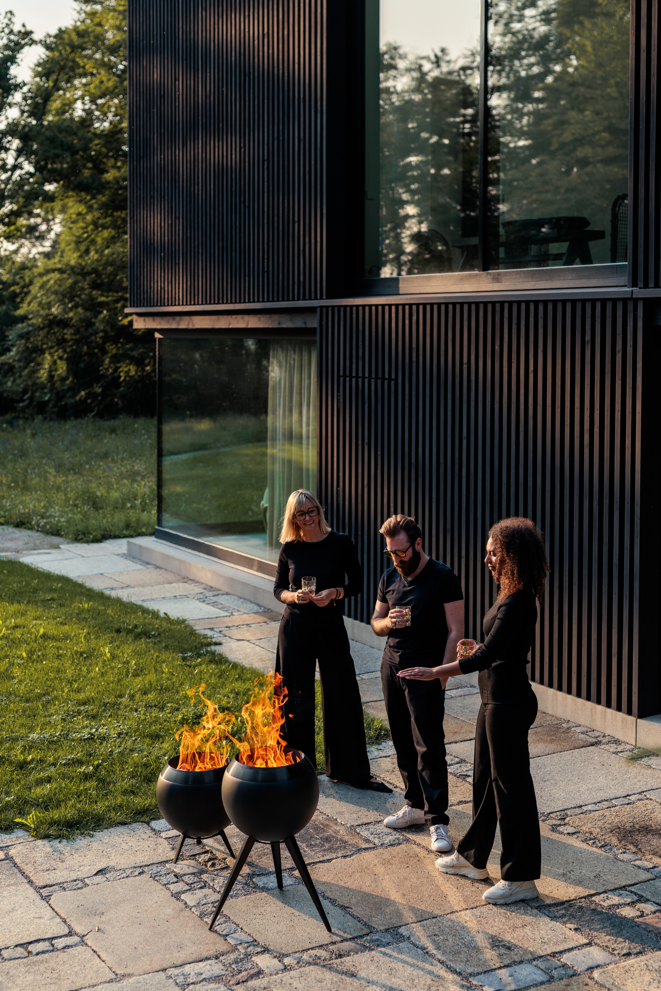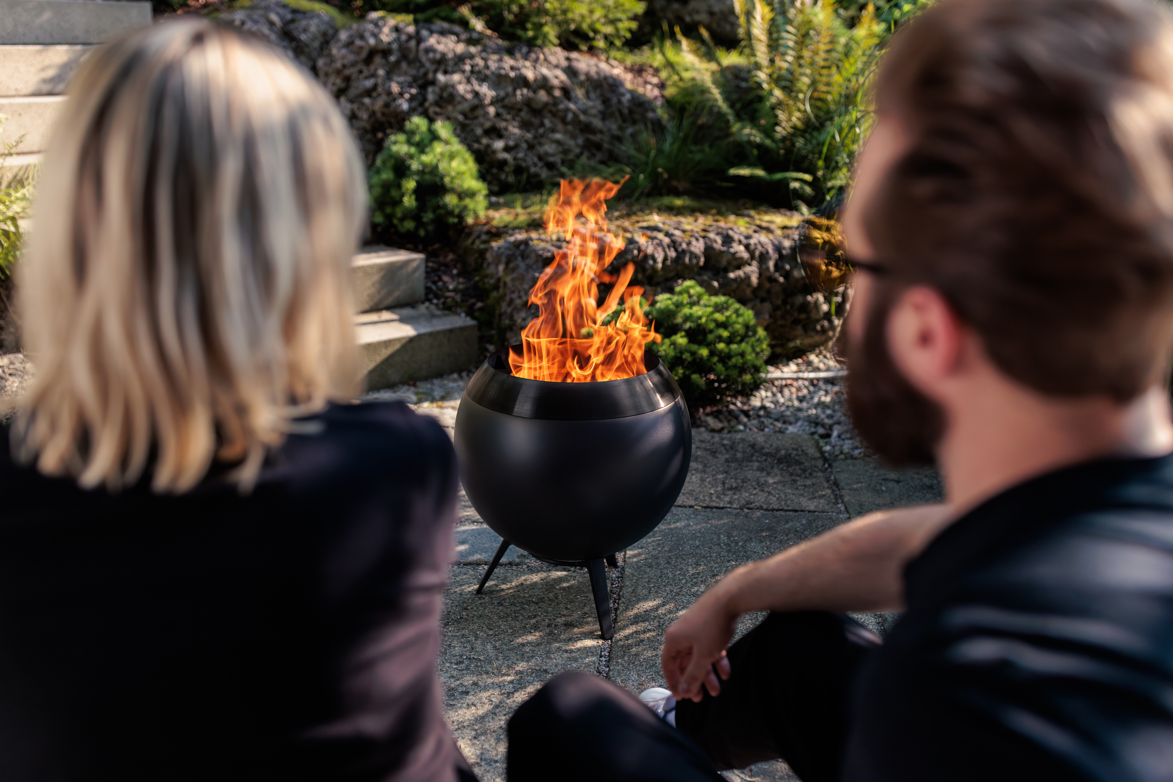 höfats ist eben immer auch, was du draus machst: Wahlweise als Grill und Feuerkorb einsetzbar, ist Moon all Black von der Stahlkugel bis zum Fuß vollständig schwarz. Bisher sichtbare Edelstahl-Elemente wie die Aufsatzdüse und der Fuß sind mit einer PVD-Beschichtung veredelt. Dadurch verstärkt dieser Look den Kontrast zwischen dem leuchtenden Feuer und Moon und lässt die Flammen besonders archaisch wirken. Wer möchte, legt noch die schwarze Plancha sowie saftige Steaks oben drauf und bleibt damit kulinarisch ursprünglich. Aber auch marinierte gelbe und rote Paprika, grüner Spargel oder lilafarbene Auberginen sind auf der Moon all Black Edition gern gesehene Genüsse für den Grillabend mit Freund*innen, Kolleg*innen oder der Familie. Nach dem Grillen zeigt sich Moon einmal mehr als moderner, urbaner Feuerkorb.