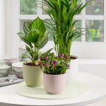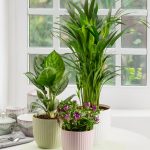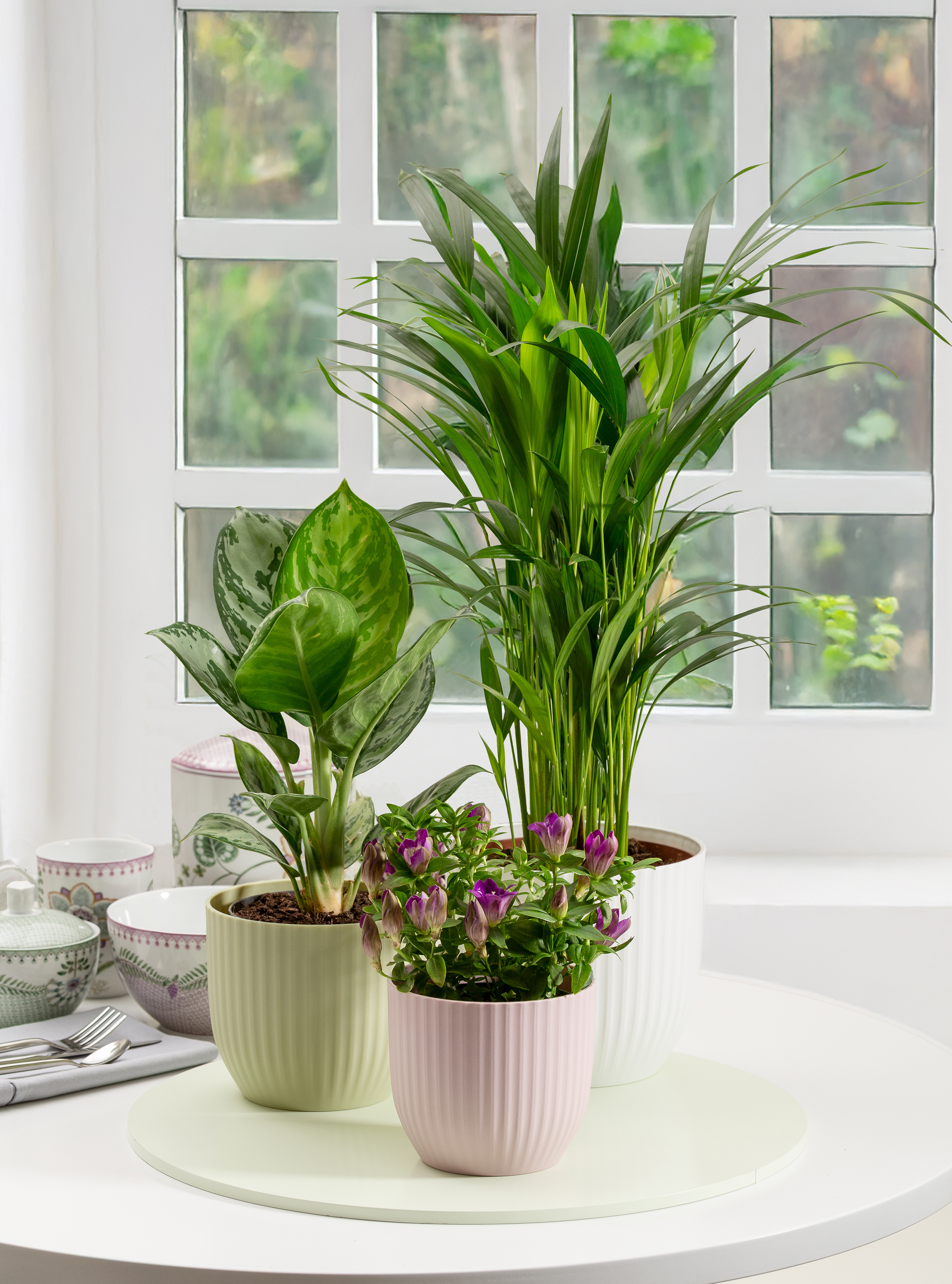 Kleine Deko-Oasen, die sich wunderschön ins helle Wohnambiente einfügen, entstehen mit einem Arrangement aus Kolbenfaden (Aglaonema Jungle Silver), Betelpalme (Areca) und Pflanzen mit Blüten, die die Farben von Nova aufgreifen.