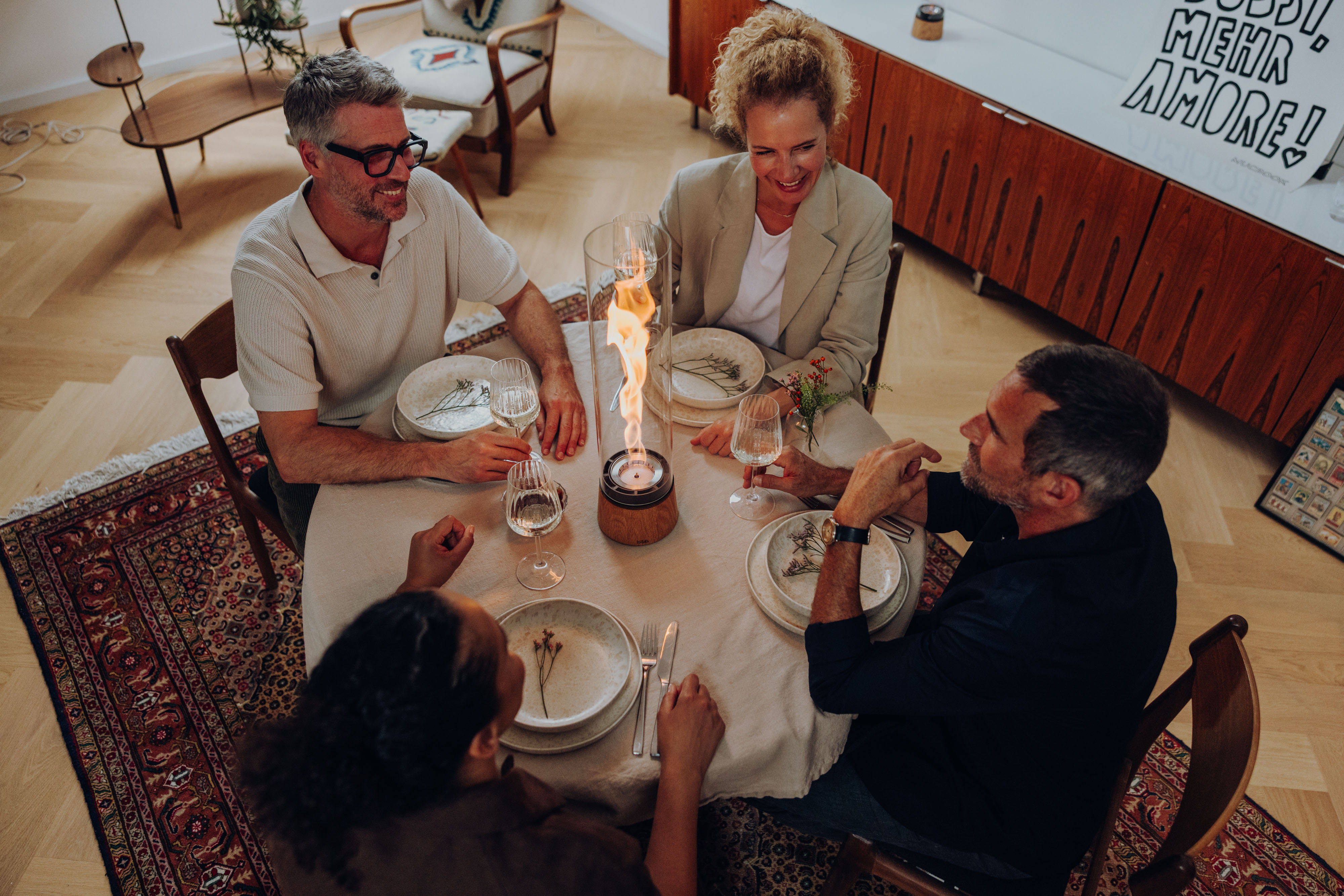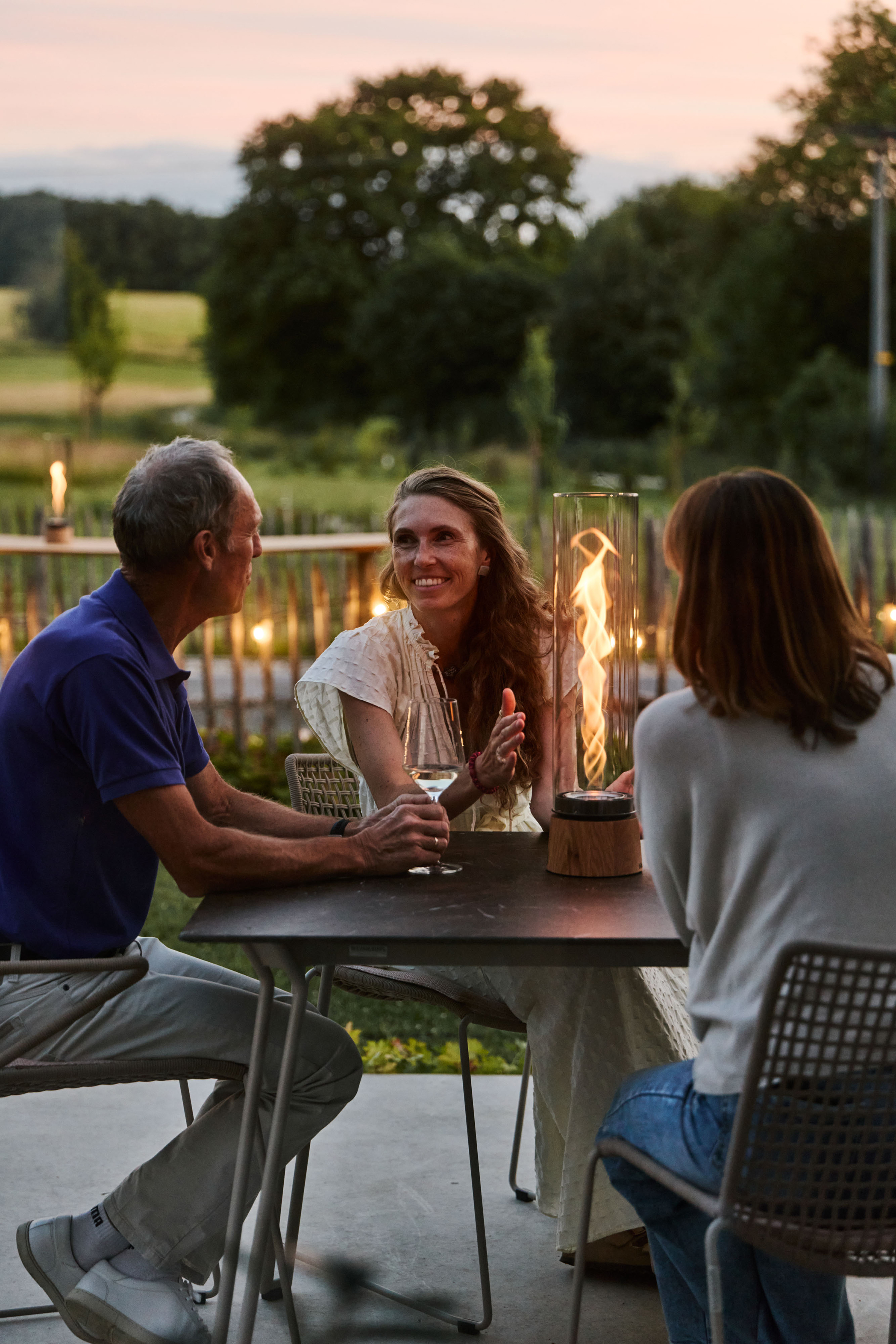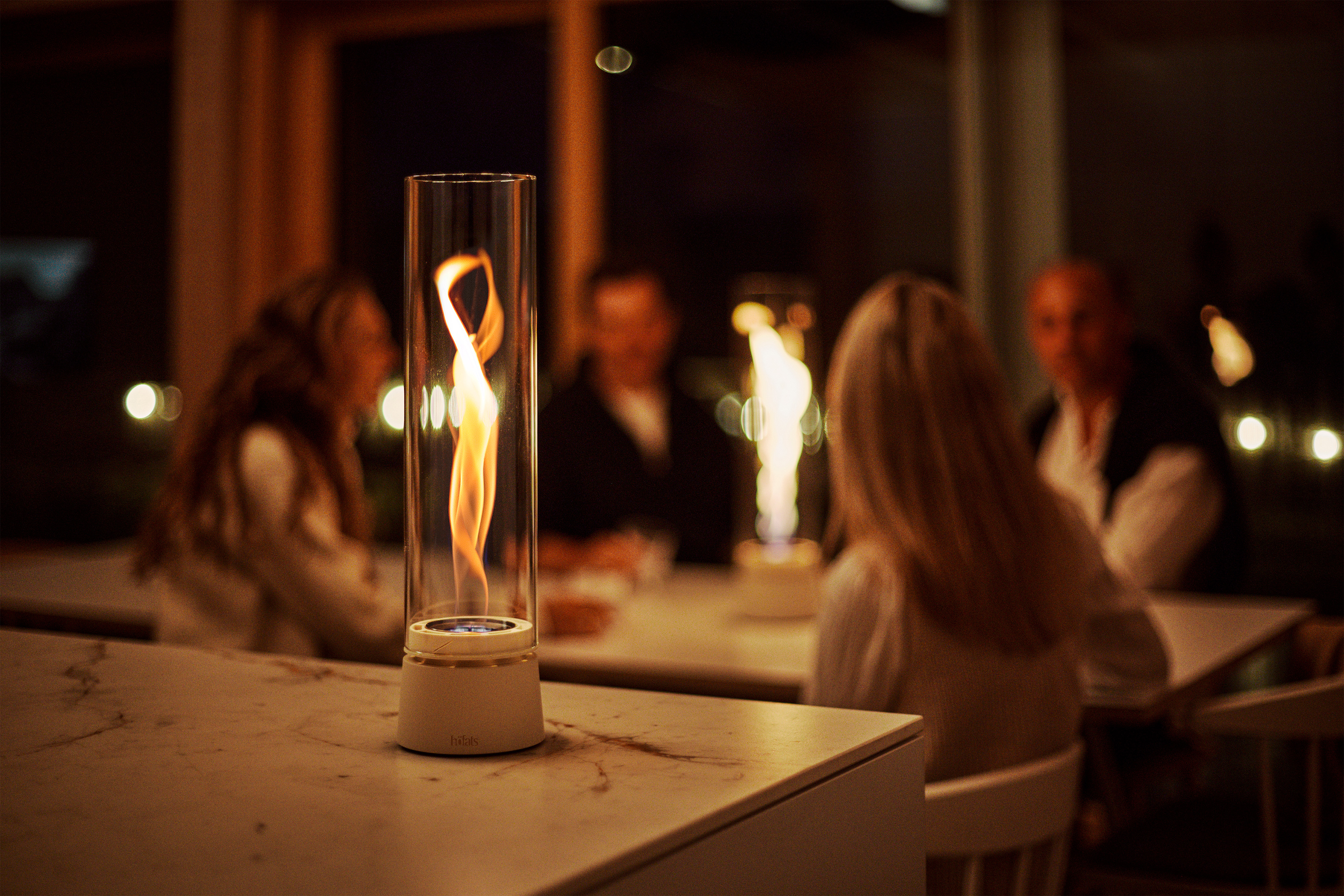 Ästhetisch verborgen befindet sich im Standfuß der patentierte Bio-Burner: Dessen innovative Brennertechnologie erzeugt eine helle und markante Flamme, die selbst bei Tageslicht sichtbar ist. Mittels Schutzventil wird der Bio-Burner mit höfats flüssigem Bioethanol befüllt und garantiert dann mehr als 1,5 Stunden eindrucksvolles Flammenspiel. Mit dem Auflegen des Eco-Rings lässt sich die Flammenhöhe variieren und die Brenndauer um 50 Prozent steigern.