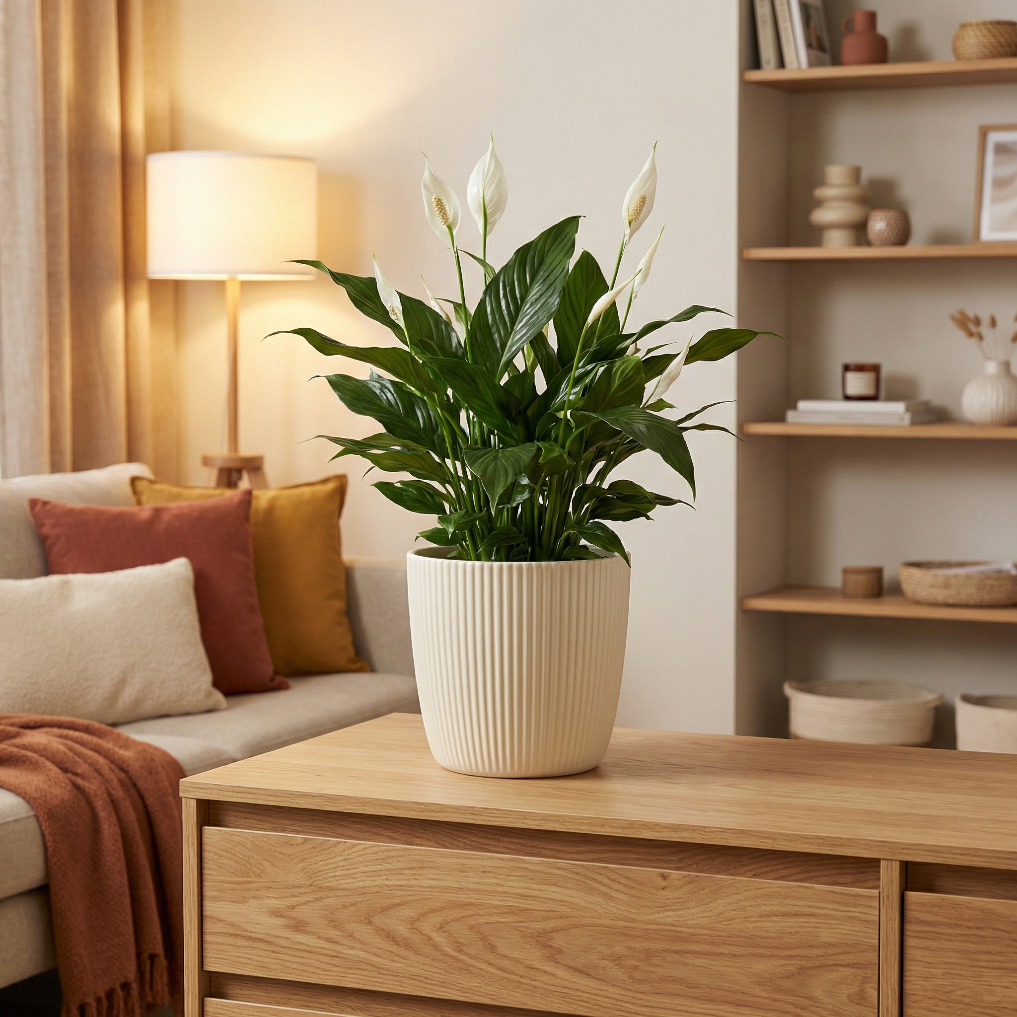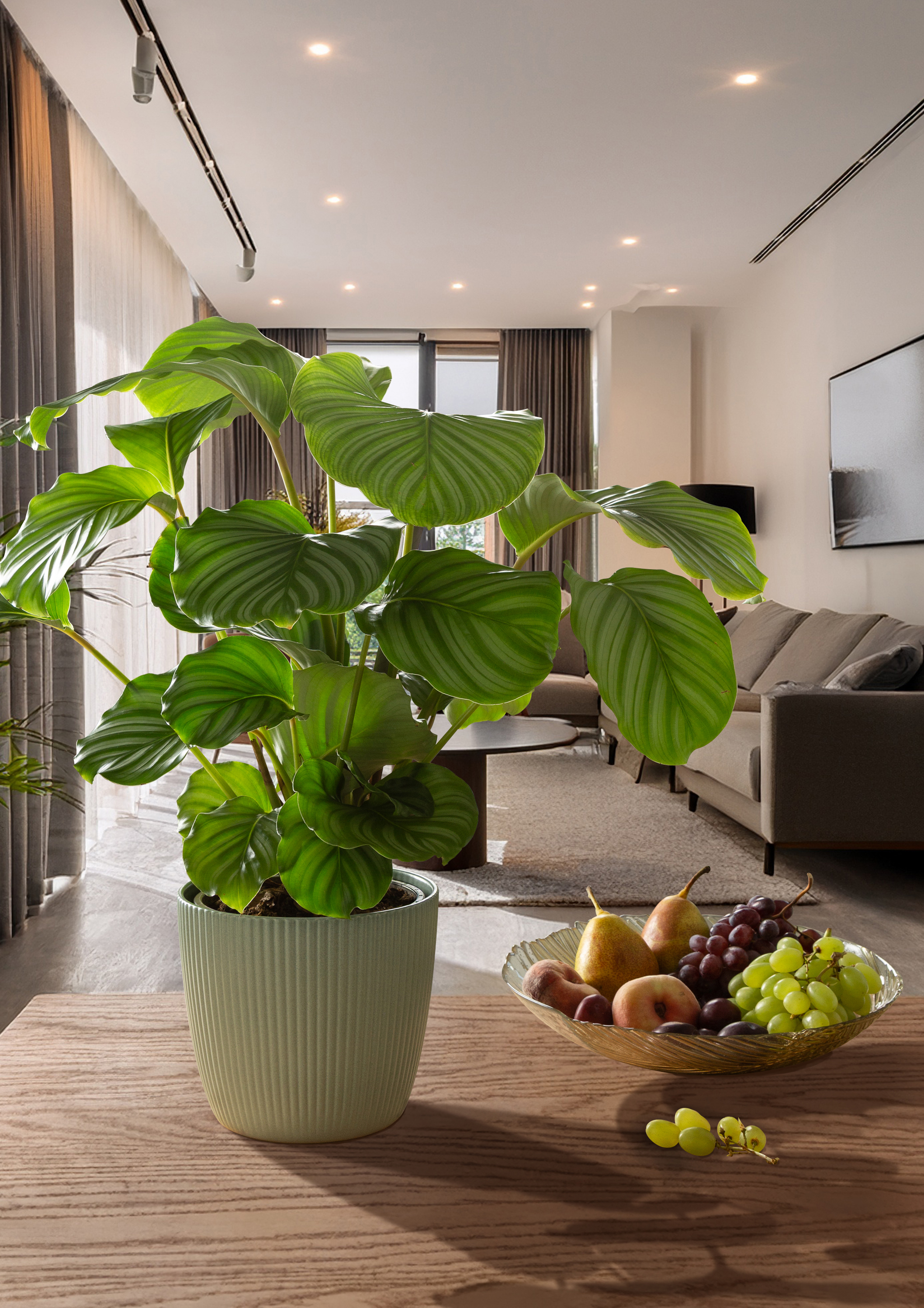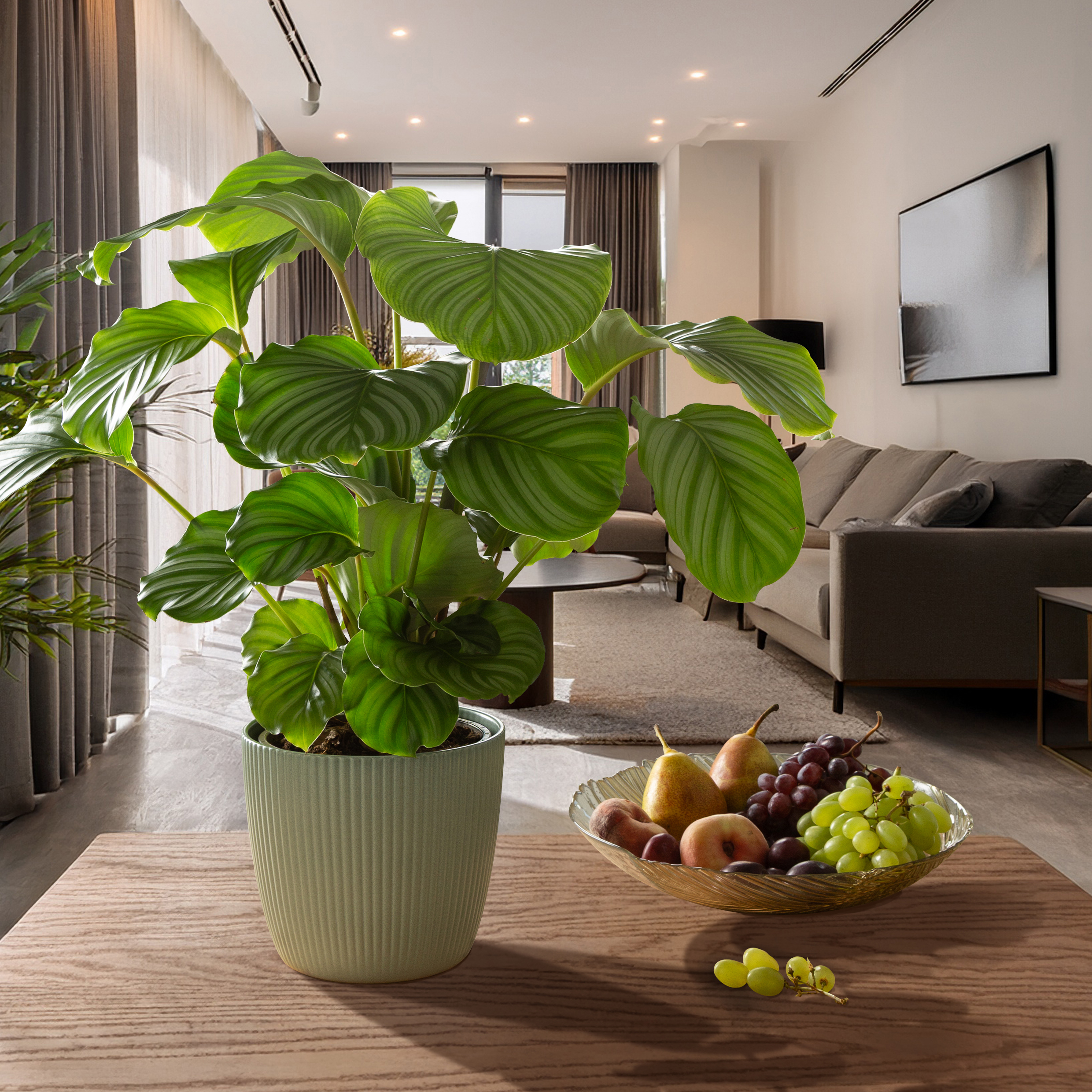 Hauptelement des gemütlichen wie modernen Einrichtungsstils ist Holz. Alle Farben von Aura passen perfekt auf Tische und Sideboards aus Eiche, Buche oder Nussbaum. Großpflanzen wie eine Calathea orbifolia (Korbmaranthe) auf dem Tisch runden das Gesamtbild ab, denn der Urban Jungle ist schon lange nicht mehr auf Fensterbänke und den Boden begrenzt. Und auch bei den Größen können Pflanzenbegeisterte mit Aura aus dem Vollen schöpfen. Creme, Dry Reed, Jade und Anthrazit lassen sich in verschiedenen Größen bis XL kombinieren sowie mit Peach in kleineren Formaten arrangieren.